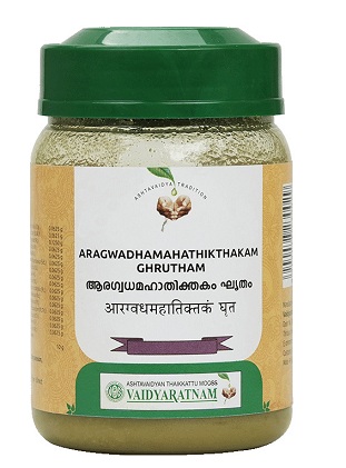 Vaidyaratnam Aragwadhamahathikthakam Ghrutham is an Ayurvedic formulation. This herbal ghee is traditionally used for skin disorders.
