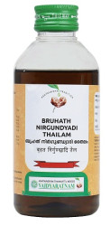 Vaidyaratnam Bruhath Nirgundyadi Thailam: Nirgundyadi Thailam is an Ayurvedic oil.It is an herbal medicine,used mainly in the treatment of diseases of ear nose and throat.It is prepared in sesame oil/coconut oil base.