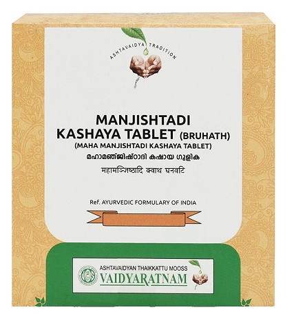 Vaidyaratnam Manjishtadi Kashaya Gulika Tablet (Bruhat) is an effective ayurvedic medicine used in the treatment of skin diseases, gout, syphilis, nonhealing wounds. It is also used in the treatment of obesity and hypercholesterolemia and eye diseases.