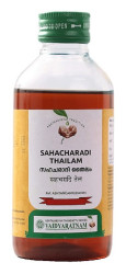 Vaidyaratnam Sahacharadi Thailam: Very effective in all types of Rheumatic diseases especially affected in the lower extremities, Lumbago, Varicose veins, Mental disorders etc.Sahacharadi Thailam is an Ayurvedic herbal oil used in treatment of Vata imbalance disorders,muscle and joint stiffness and convulsions.It is used orally and also for massage.