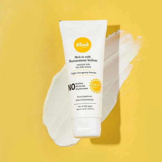 Vilvah Stores Melt In Milk Sunscreen SPF 30 : India's first high performance natural Sunscreen SPF 30 PA+++ is an aqua-based Sunscreen lotion with the goodness of soy milk extract. Its lightweight and non-greasy formula is suitable for the humid climate without leaving any white cast. This sunscreen is curated with effective and safe UV filters like Tinosorb S, Tinosorb M and Zinc Micronized to protect your skin from dangerous UVA and UVB. Feel like wearing nothing with our water-resistant sunscreen