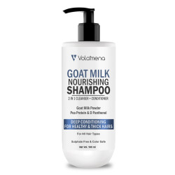 Volamena Goat Milk shampoo is gentle 2 in 1 hair cleanser infused with Goat Milk protein,& D panthenol (Vitamin B5 ) which strengthens weak and damaged hair from within the root and aids in reducing hair fall while adding body, volume and luster to hair.