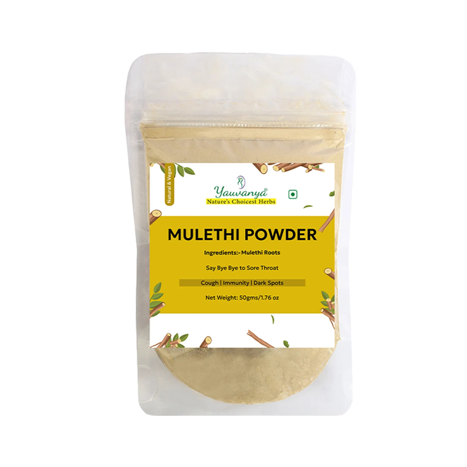 Mulethi powder offers skin healing, skin lightening and anti-aging benefits. It helps minimize dark spots, blemishes and marks. It fades sun tan and pigmentation, thus giving a radiant look to your skin.