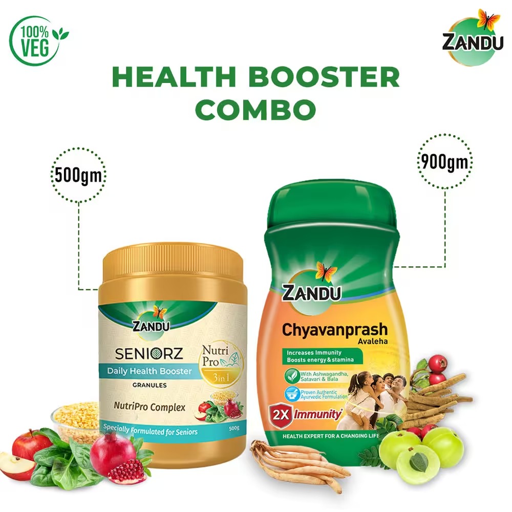 Zandu Seniorz Daily Health Booster Granules has been produced specially for senior citizens. In old age, they go through multiple health problems. Some are common with ageing while some problems arise out of lifestyle or any other external aggressors. These granules help you boost immunity, build strength & stamina, and improve your digestion. It also helps you get rid of feeling tired all the time and helps you to eat and digest the food of your choice. Additionally, it is made of 100% Natural and Ayurvedic ingredients like Moong, Banana, Pomegranate, Apple, Ashwagandha, and Triphala. These are some of the powerhouses of nutrition usually recommended by doctors and nutritionists. They have been used and studied in Ayurveda for decades. These granules contain no preservatives, salt or sugar and are scientifically tested. Additionally, these health booster granules are convenient to consume and carry anytime and anywhere. This one product can help you with better energy immunity and digestive system to live through the yesteryears of your life to the fullest.